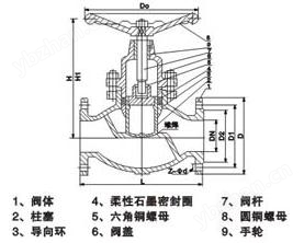 美標柱塞閥(UJ41H)是由閥體、閥蓋、閥桿、柱塞、導向、密封環、手輪等零件組成(如圖)。當手輪旋轉時,通過閥桿帶動柱塞在導向套中上、下往復運動,使柱塞端部斜錐面與閥座錐面完成閥門的開啟與關閉功能。在閥門中柱塞與密封環間采用過盈配合,通過調節中法蘭螺栓預緊力,使密封環壓縮所產生的側向力與閥體中孔面柱塞外圓密封,從而保證了閥門的密封性。