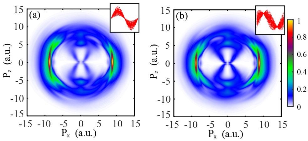 圖2 (a)相位壓縮相干態下的質子動量分布;(b)振幅壓縮相干態下的質子動量分布