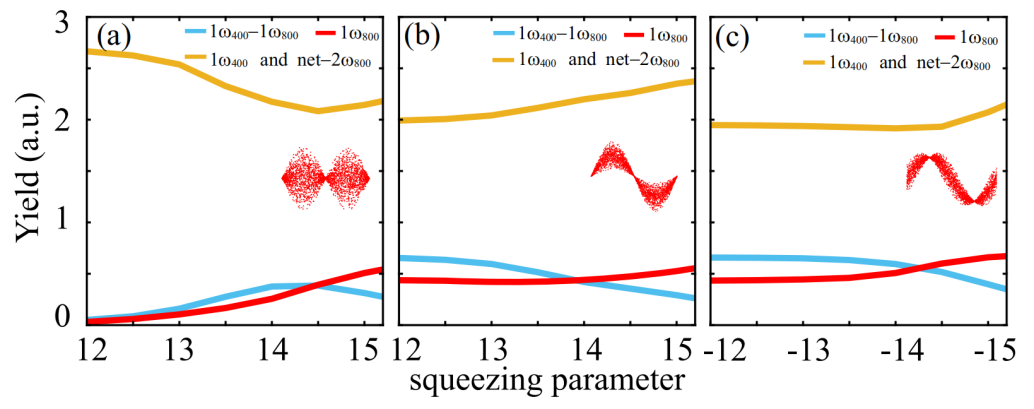 研究人員進一步研究了豎直偏振的800nm量子光分別在相位壓縮相干態和振幅壓縮相干態下,得到的質子動量分布,分別如圖2a和2b,結果表明量子光場的壓縮性質對分子解離過程有重要影響。此外,研究人員還系統分析了這幾種不同量子態下,壓縮度對不同解離通道產率的調控,如圖3所示。結果表明,壓縮度作為一個可調參數可實現對解離通道的選擇性控制。光場的量子漲落顯著調制了各解離通道的相對產率,并且不同光場的調制各不相同,在真空壓縮態下(圖3a),隨著壓縮度增加,不同解離通道之間出現動態競爭,導致通道的產率呈現“先升后降”的非單調變化;而在對于振幅壓縮相干態(圖3c),只有在壓縮度足夠大時才會打破固定振幅近似(r<-13.5),引發產率的變化。這些發現揭示了一種全新的量子調控機制,展示了通過調節光的量子特性,以操控分子解離過程的可能性,為在量子層面引導光化學反應路徑提供了全新的研究手段。