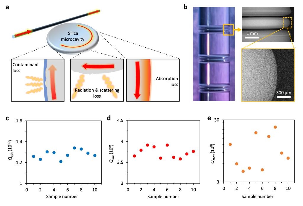 光學微腔能夠在空間和時間維度上限制光場,其核心指標——品質因子(Q因子)決定了光子諧振壽命。Q因子越高,光與物質相互作用越強,可大幅提升腔內功率、降低非線性效應閾值,是構建精密激光光源、光學頻率梳的核心載體。微腔的本征損耗由輻射損耗、散射損耗、吸收損耗以及污染物損耗構成(如圖1a所示)。目前,減輕輻射、散射以及吸收損耗等策略是提升Q因子的主流方法。然而,二氧化硅微腔的本征Q因子(Q0,通常在108量級)仍遠低于理論極限(Qabs,通常趨近1010量級)。因此,定量分析和表征影響微腔Q因子各種損耗貢獻,和去除污染物損耗,是進一步提升Q因子最重要也是最終的關鍵一步。