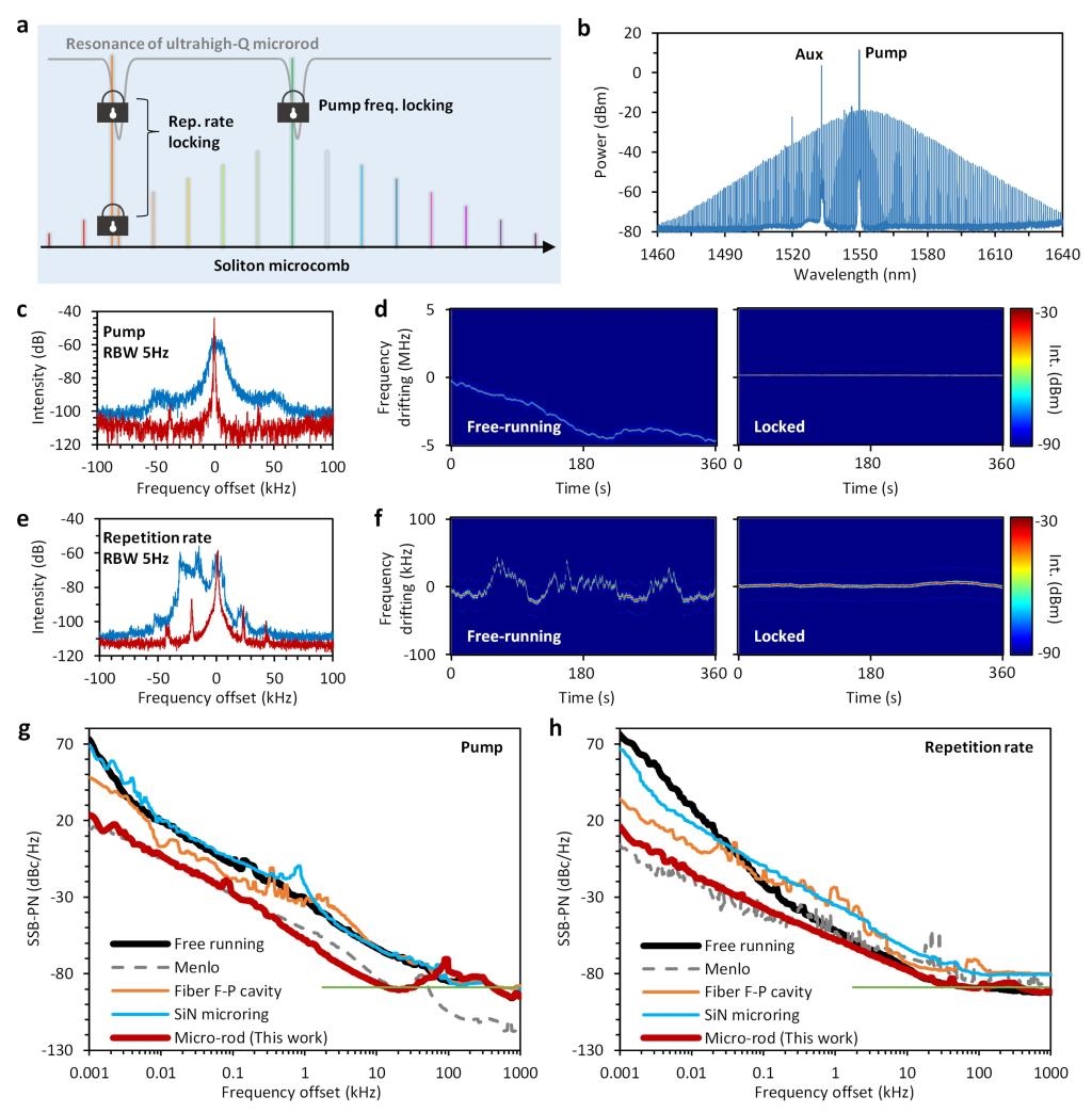 圖3 利用超高Q因子微腔實現片上孤子微梳的全穩定方案和相位噪聲抑制性能