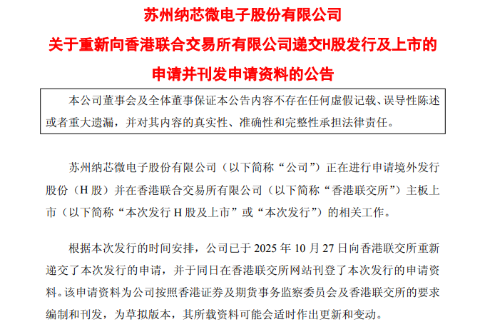儀表網 企業動態】據港交所10月27日披露,納芯微(688052.SH)于10月27日再次向香港聯交所主板遞交了上市的申請,并于同日刊登了相關更新文件,中金公司、中信證券和建銀國際為聯席保薦人。該公司曾于4月25日首次遞表港交所,后因六個月期滿失效。