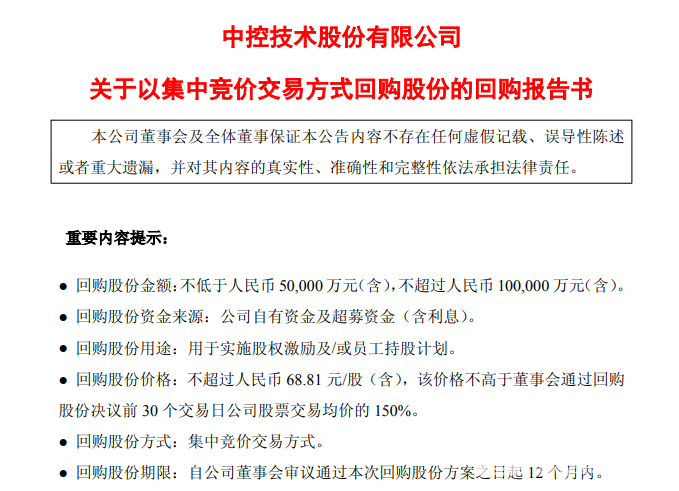 儀表網 企業動態】10月24日,中控技術(688777)公告稱,公司擬使用自有資金及超募資金以集中競價的方式向社會公眾股東回購公司股份。本次回購股份的資金總額不低于5億元且不超過10億元,價格不超過人民幣68.81元/股(含)。本次回購股份將用于實施股權激勵及/或員工持股計劃。