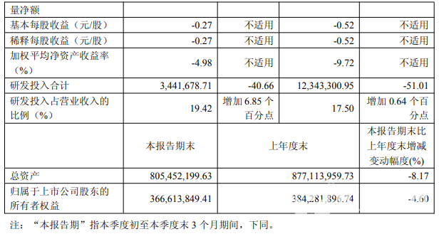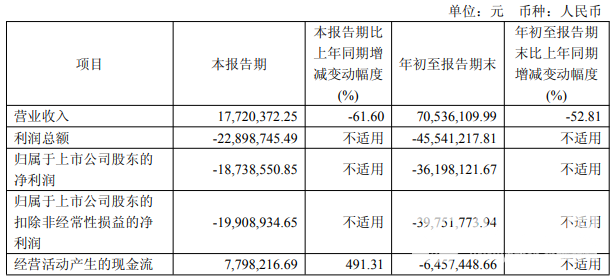 其中第三季度,公司營業收入為1772萬元,同比下降61.6%;歸母凈利潤自去年同期虧損9萬元變為虧損1874萬元,虧損額進一步擴大;扣非歸母凈利潤自去年同期虧損847萬元變為虧損1991萬元,虧損額進一步擴大;EPS為-0.2659元。截至三季度末,公司總資產8.05億元,較上年度末下降8.2%;歸母凈資產為3.67億元,較上年度末下降4.6%。