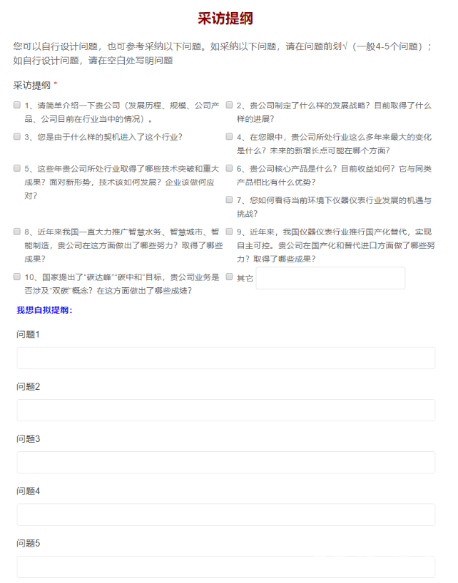 根據儀表網多年豐富的線下參展采訪經驗,我們列出了幾個較為常見的,能夠讓觀眾快速了解您的企業或者觀眾可能感興趣的問題。如果您有其他想法,也可以自擬提綱。