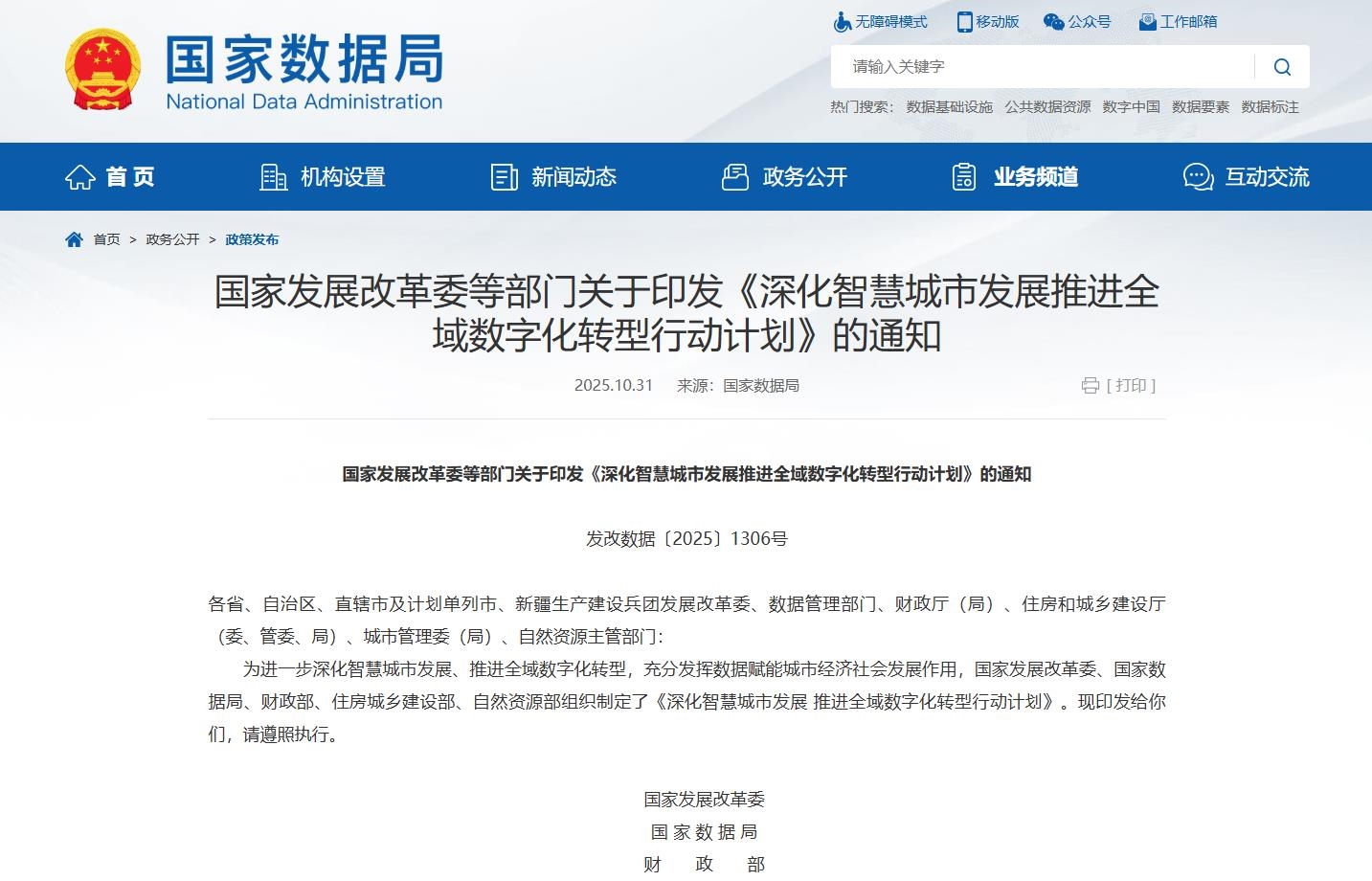 儀表網 行業政策】 2025年10月14日,國家發展改革委、國家數據局、財政部、住房城鄉建設部、自然資源部五部門聯合印發《深化智慧城市發展 推進全域數字化轉型行動計劃》(以下簡稱《行動計劃》),并于10月31日正式公布,旨在充分發揮數據賦能城市經濟社會發展作用,扎實推進城市全域數字化轉型,建設便捷高效的智慧城市。
