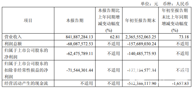 其中第三季度,公司營業收入為8.42億元,同比上升62.8%;歸母凈利潤自去年同期虧損1.42億元變為虧損6248萬元,虧損額有所減少;扣非歸母凈利潤自去年同期虧損1.55億元變為虧損7154萬元,虧損額有所減少;EPS為-0.4383元。