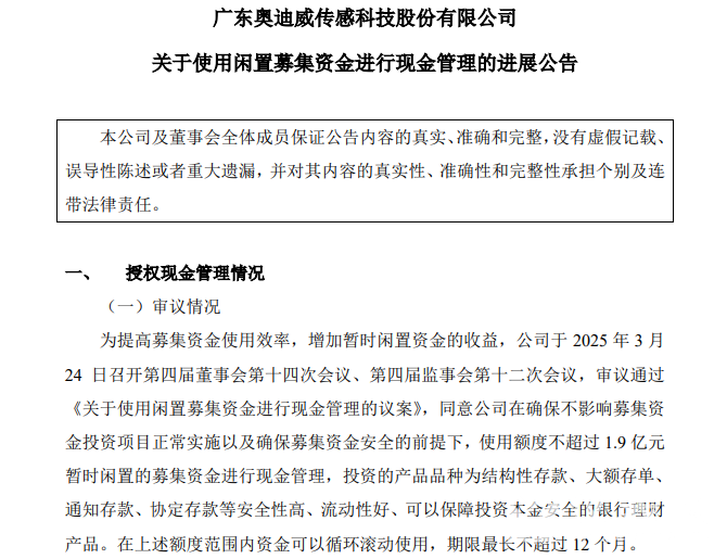 奧迪威在公告中表示,為提高募集資金使用效率,增加暫時閑置資金的收益,在確保不影響募集資金投資項目正常實施以及確保募集資金安全的前提下,公司擬使用額度不超過1.9億元暫時閑置的募集資金進(jìn)行現(xiàn)金管理。
