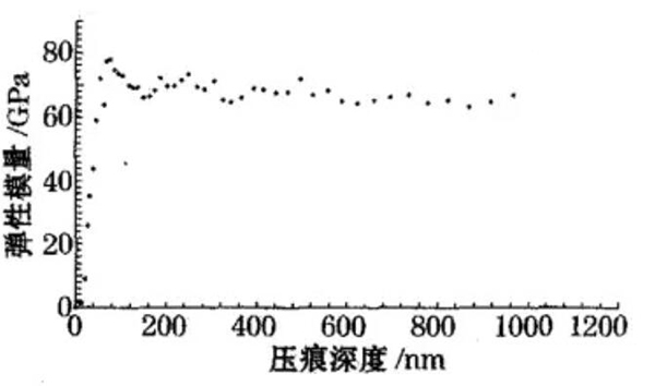 下圖是壓痕深度1μm時(shí)單晶鋁彈性模量與壓痕深度的關(guān)系。此外,納米硬度儀還可以輸出接觸剛、實(shí)時(shí)載荷等隨壓頭位移的變化曲線,試驗(yàn)者可以從中獲得豐富的信息。