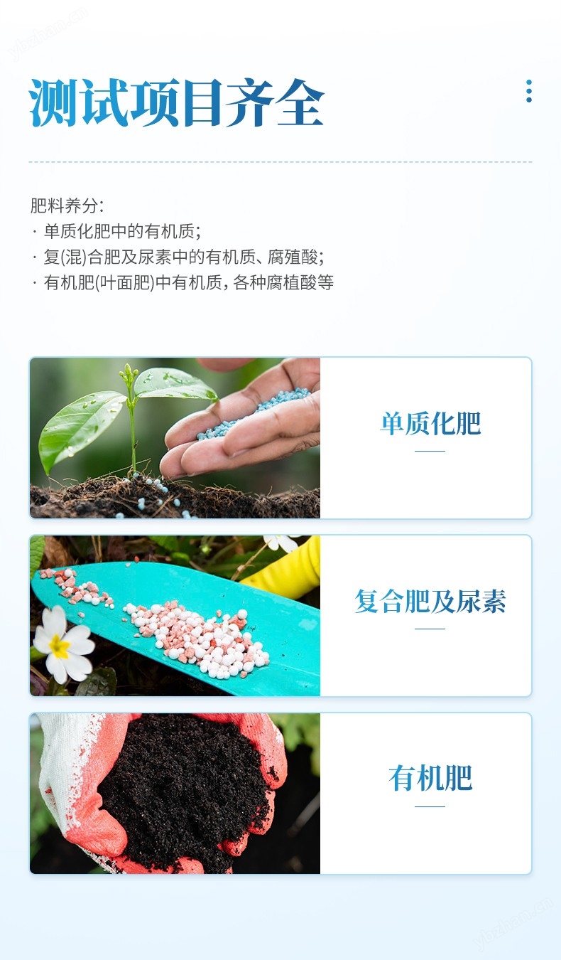 1、可檢測化肥、有機肥(含葉面肥、水溶肥、噴施肥等)、植株中的有機質、腐殖酸等。