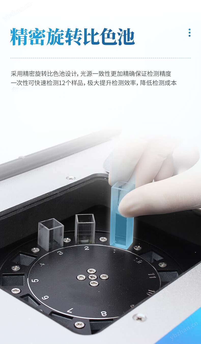 3、采用精密旋轉比色池設計,光源一致性更加精確保證檢測精度。一次性可快速檢測12個樣品,極大提升檢測效率,降低檢測成本。