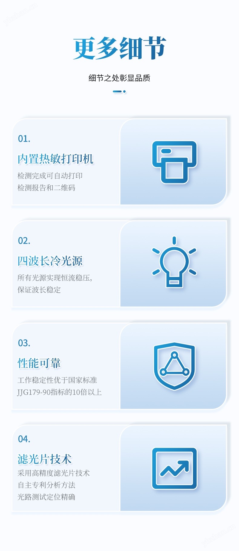 4、采用高精度濾光片技術自主分析方法(ZL 2018 2 1777724.7),比色槽部分采用標準1cm比色皿,無機械位移及磨損,光路測試定位精確,保證檢測結果優于國標要求。