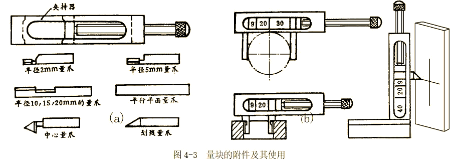 為了進一步拓寬量塊的應用領域,更好地滿足多樣化的測量需求,我們提供了成套的量塊附件。這些附件主要包括不同長度的夾持器和專為測量設計的量腳,如圖4-3(a)所示。一旦將量塊與這些附件組合在一起,它們不僅可以用于校準量具的尺寸,例如校準內徑百分尺,還能進行軸徑、孔徑、高度以及劃線等各項測量工作,如圖4-3(b)所示。